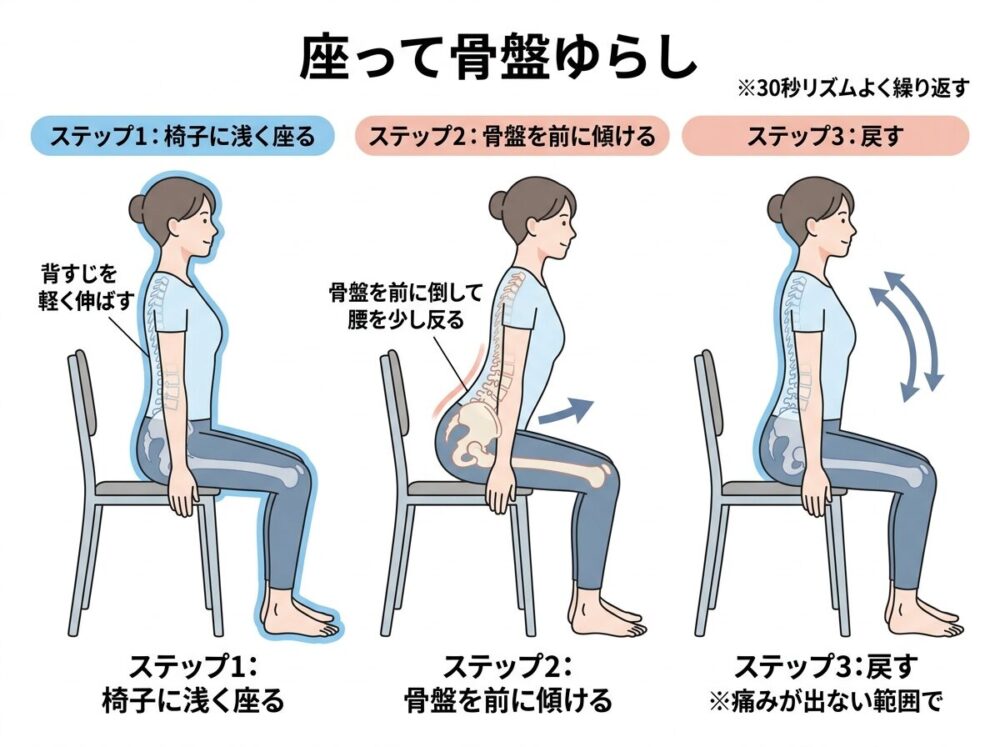 ①(30秒):座って骨盤ゆらし(腰の固まり解除)