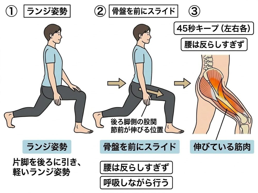 ②(左右45秒):腸腰筋ストレッチ(反り腰・座り疲れ向け)