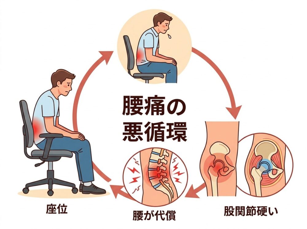 デスクワーク腰痛は「座りっぱなし→股関節とお尻が硬い→腰が代わりに動きすぎる」が典型です。先に原因を知ると、3分ストレッチが“なぜ効くのか”が腑に落ち、再発予防にもつながります。