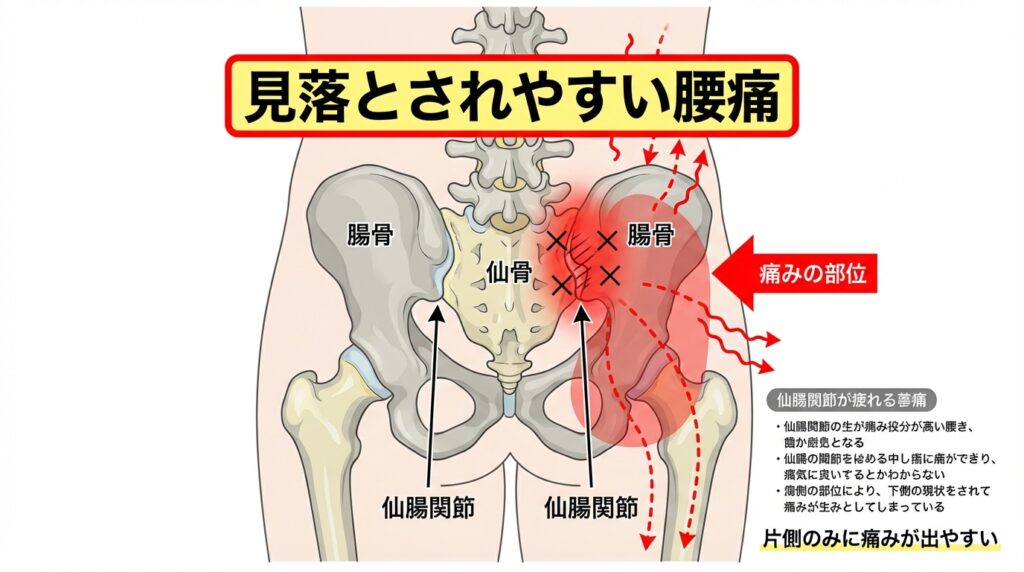 腰というより、骨盤のつなぎ目(仙腸関節)が原因になるタイプです。片側の痛みとして出やすく、合う対策ができると改善が早いこともあります。