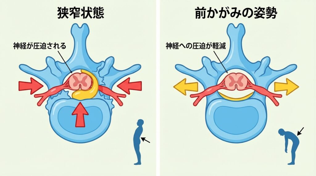 「前かがみで症状が楽になる」性質は医師会の解説でも説明があります。[Source]