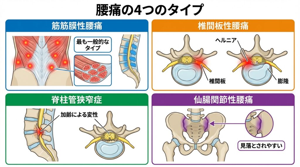- 腰痛は筋筋膜性/椎間板性/脊柱管狭窄症/仙腸関節性の4種類で整理すると分かりやすい